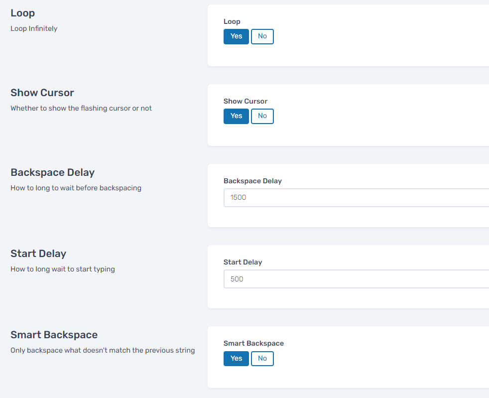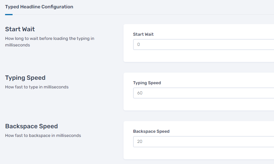 Backspace Delay: Set the delay after the headline is fully typed before backspacing (in milliseconds).